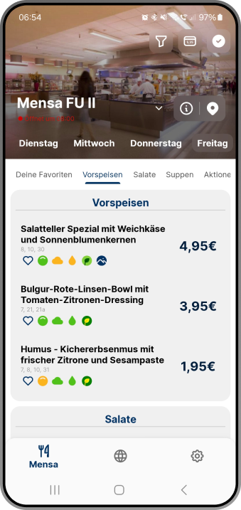 Passe den Mensaplan an deine Ernährung und Allergien an, damit du nur die Gerichte siehst, die für dich relevant sind.